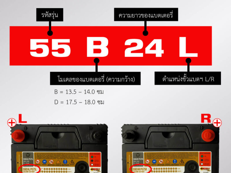 โดยตัวเลข 55 คือ รหัส หรือรุ่น ของแบตเตอรี่ (ซึ่งไม่ได้มีความหมายถึงขนาดของความจุหรือแอมป์ของแบตเตอรี่ อย่างที่หลายๆท่านเข้าใจกัน)